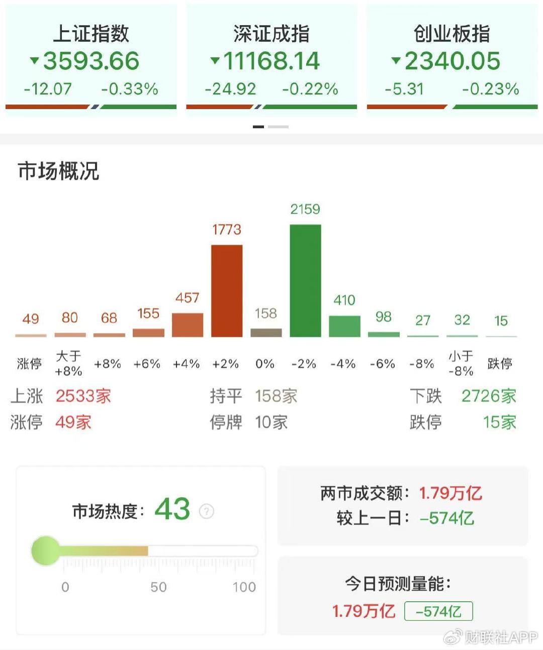 财联社7月25日讯,市场全天震荡调整,三大指数小幅下跌,科创50指数午后在芯片股带动下逆势拉升涨超2%。沪深两市全天成交额1.79万亿,较上个交易日缩量574亿。盘面上,市场热点较为杂乱,个股上涨和下跌家数基本相当。从板块来看,芯片股集体爆发,寒武纪涨超10%。AI应用股表现活跃,因赛集团20CM涨停。医疗器械概念股震荡走强,康泰医学20CM涨停。下跌方面,超级水电概念股集体大跌,深水规院20CM跌停。截至收盘,沪指跌0.33%,深成指跌0.22%,创业板指跌0.23%。