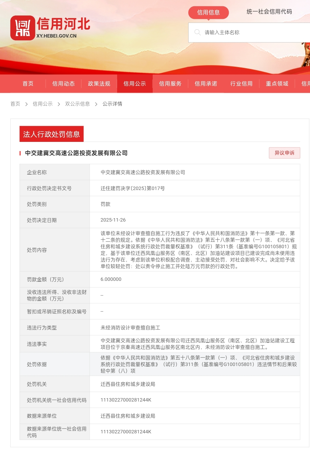 文号“迁住建罚决字﹝2025﹞第017号”行政处罚决定书显示,中交建冀交高速公路投资发展有限公司迁西凤凰山服务区(南区、北区)加油站建设工程项目位于京秦高速迁西凤凰山服务区南北区内,未经消防设计审查擅自施工。