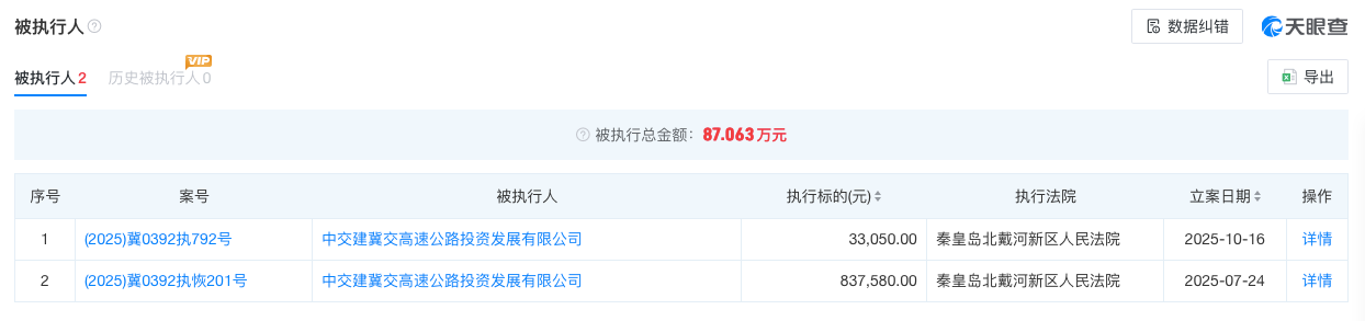 据天眼查数据,中交建冀交高速公路投资发展有限公司目前是被执行人,被执行总金额为87.063万元。